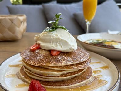 Fluffy pancakes served with seasonal fruits, maple syrup, and whipped cream cheese